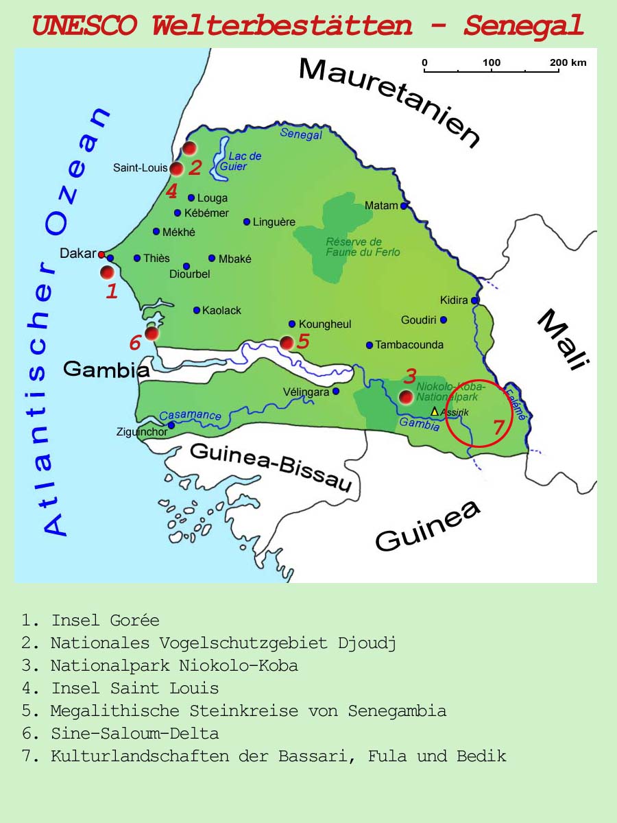 Der Senegal besitzt insgesamt sechs Nationalparks, von denen der Nationalpark Djoudj und der Nationalpark Niokolo-Koba seit dem Jahr 1981 als Nationales Vogelschutzgebiet gleichzeitig zu den insgesamt sieben UNESCO-Weltnaturerbestätten des Landes gehören.