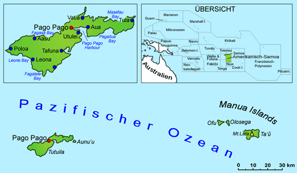Amerikanisch-Samoa grenzt mit einer Gesamtküstenlänge von 115 km an den Pazifischen Ozean - genauer gesagt liegt Amerikanisch-Samoa im Südpazifik, der so genannten Südsee. Diese Region des Pazifischen Ozeans umfasst die Polynesischen Inseln sowie Teile Melanesiens und Mikronesiens. Ausführliche Informationen zum Pazifik hier >>>