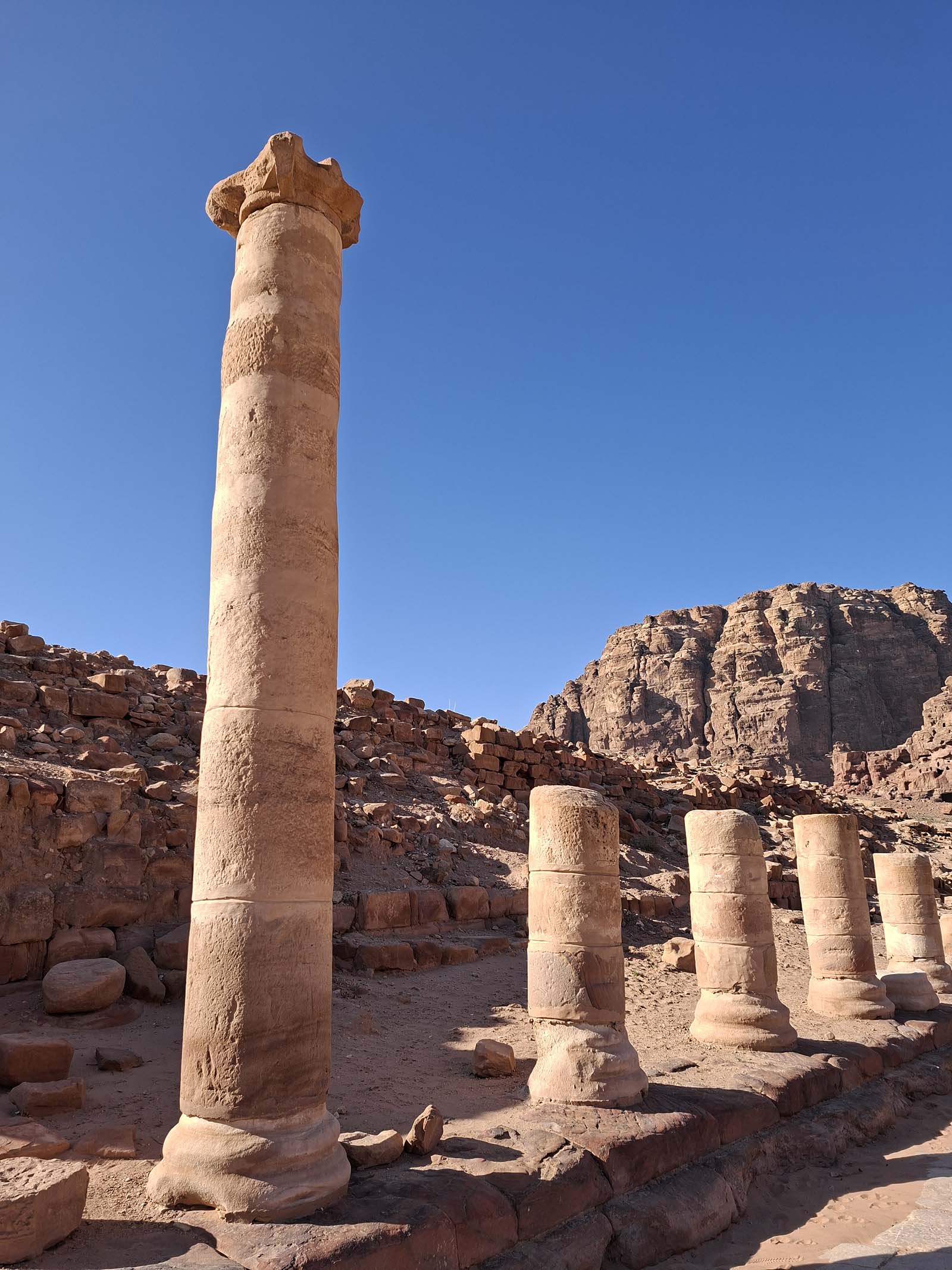 Folgt man dem Weg entlang der Königsgräber in Richtung Westen, so erreicht man die Säulenstraße. Diese frühere Hauptverkehrsstraße der Felsenstadt war einst von Grabtempeln und Wohnhäusern der Nabatäer umrahmt. Letztere existieren nicht mehr. Dafür sind neben den Tempeln auch noch Überreste des Marktes, einer byzantinischen Kirche und des Temenos-Tors erhalten geblieben. Den größten der Tempel bildet der Qasr al-Bint Firaun (siehe dort).