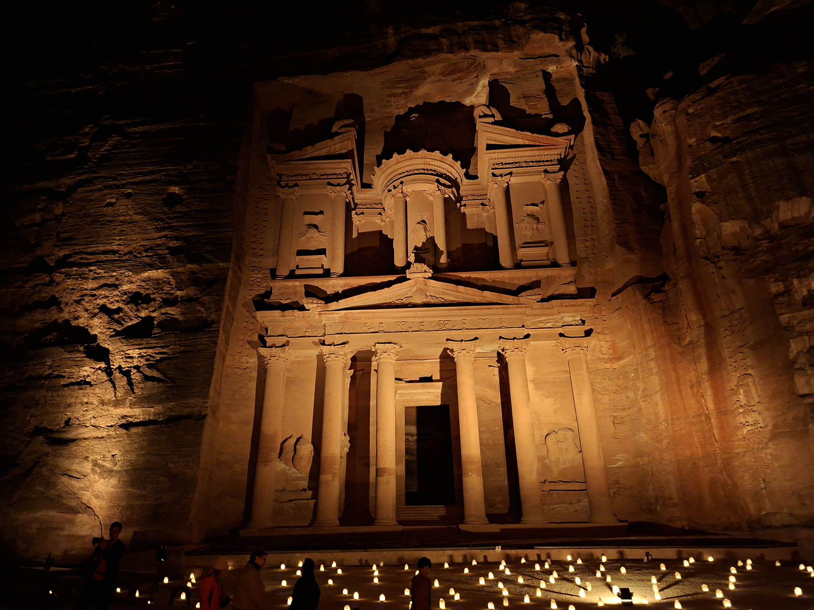 "Petra by Night" ist eine nächtliche Erlebnis-Show in der antiken Felsenstadt Petra, Jordanien. Tausende von Kerzen beleuchten den Weg durch den Siq bis vor das berühmte Schatzhaus (Al-Khazneh).