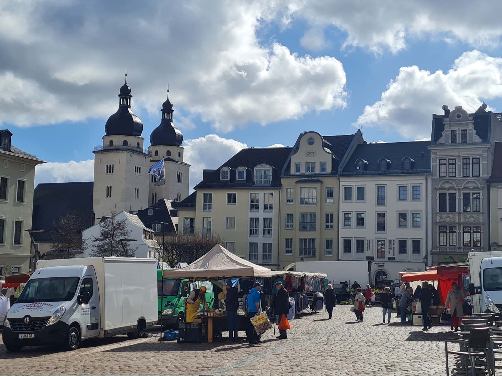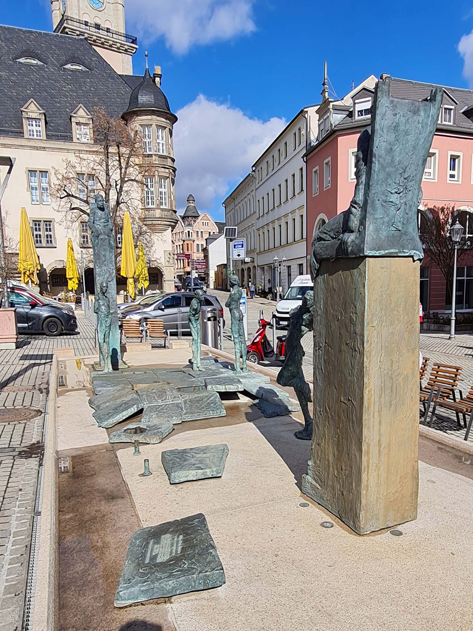 Dieses Denkmal von Peter Luban aus Plauen wurde am 7. Oktober 2010 schräg gegenüber dem Rathaus aufgestellt. Es soll an die friedliche Revolution in Plauen am 7. Oktober 1989 erinnern. Hier kam es zur ersten Großdemonstration in der DDR, die von den Sicherheitskräften nicht mehr aufgelöst werden konnte.